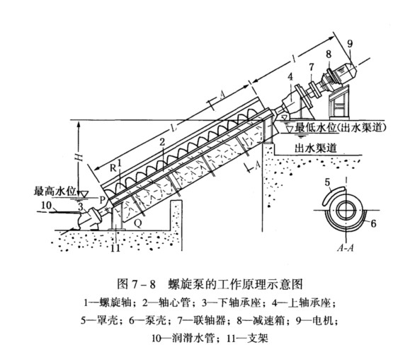 螺旋泵主要有螺旋部分、下部軸承、上部軸承、驅(qū)動(dòng)裝置和泵槽等五個(gè)部分及附屬設(shè)備組成。